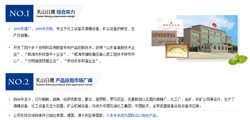 乳山市日晟机械制造有限公司位于山东省乳山市城区工业园日照路82号。公司地处胶东半岛南端,东毗威海,北临烟台,西近青岛,南濒黄海,依山傍海,交通便利。公司于1958年建厂,原属国家轻工部定点设备生产厂家,自1998年改制后,现有员工128人,其中工程技术人员26人,加工设备齐全,占地面积3万平方米,是集铸造生产、机械加...